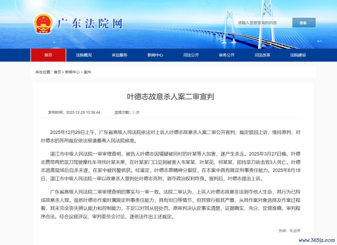 2025年12月29日洪萨速配,广东省高级人民法院依法对上诉人叶德志故意杀人案二审公开宣判,裁定驳回上诉,维持原判,对叶德志的死刑裁定依法报请最高人民法院核准。