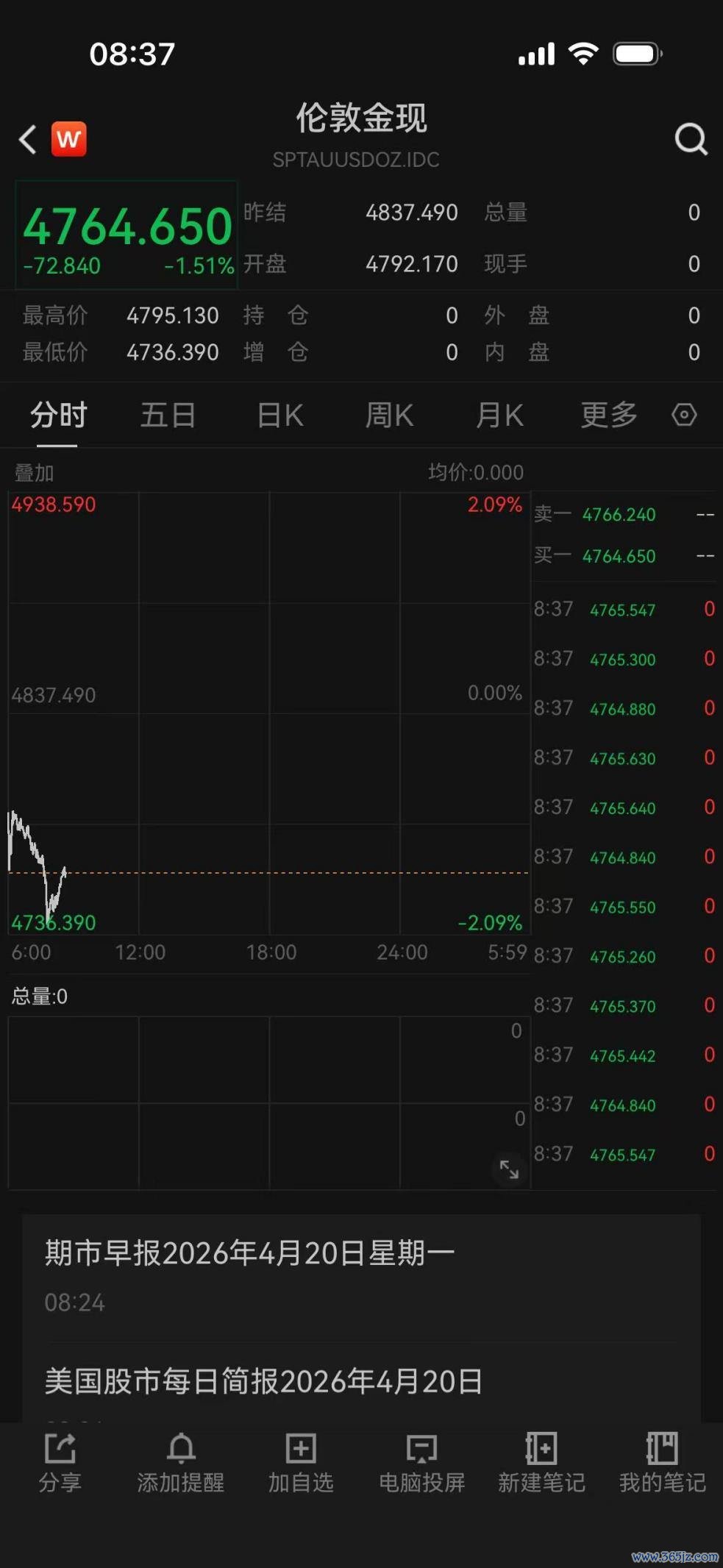4月20日早盘,国际金价大幅低开,最低触及4736美元/盎司附近,截至发稿时,仍然大跌1.51%,交投于4764.650美元/盎司。